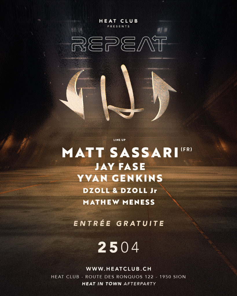 Et pour Terminer Avril en Beauté, que diriez-vous d’une Sortie en Ville ? À l’Occasion de la deuxième HEAT IN TOWN. En deux mots, Un Évent Electro Open air organisé par le Heat, complètement gratuit, devant les Universités de Sion. On commande trois Soleils pour cette Journée qui s’annonce Somptueuse !! Et l’After ? REPEAT au HEAT. On prend les mêmes et on recommence !
